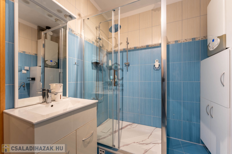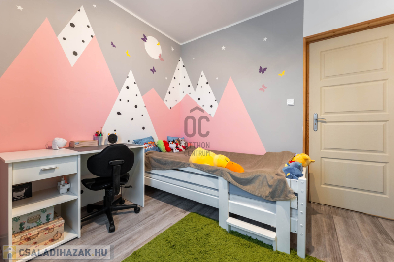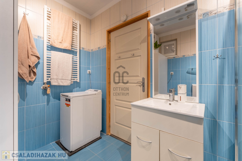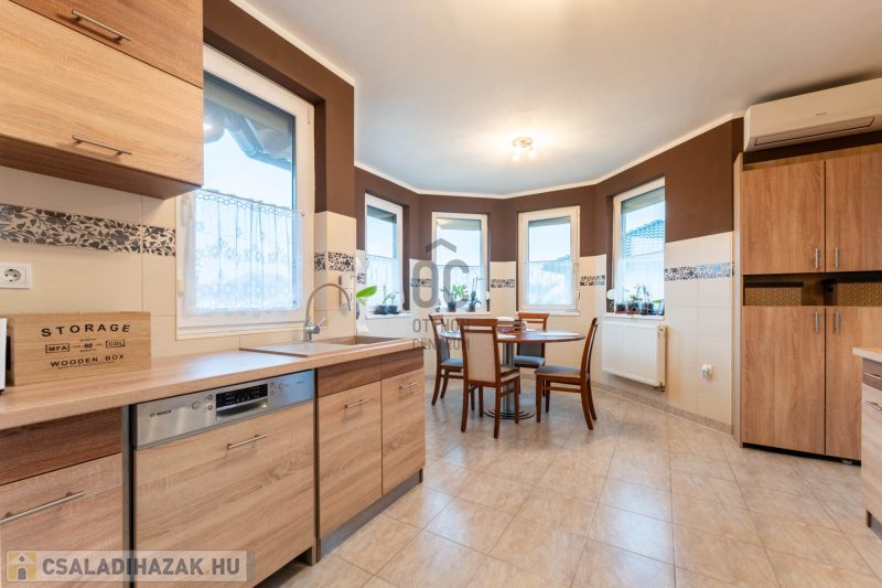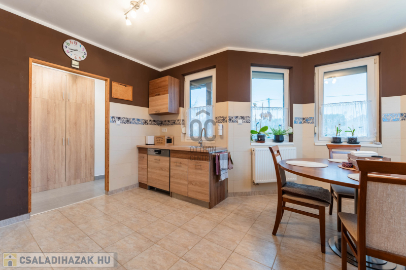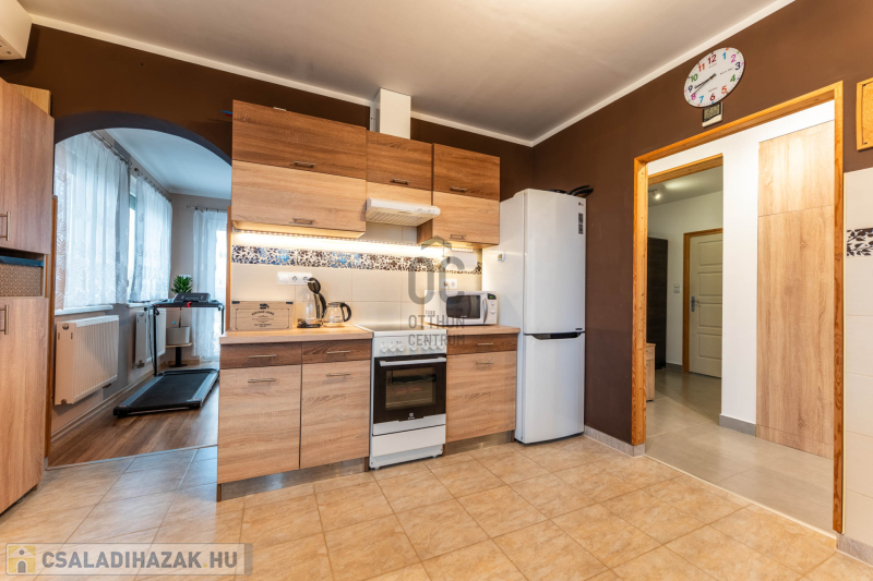 -helyiségek: 3 hálószoba, nappali, tágas konyha–étkező, WC-kézmosó, fürdőszoba,