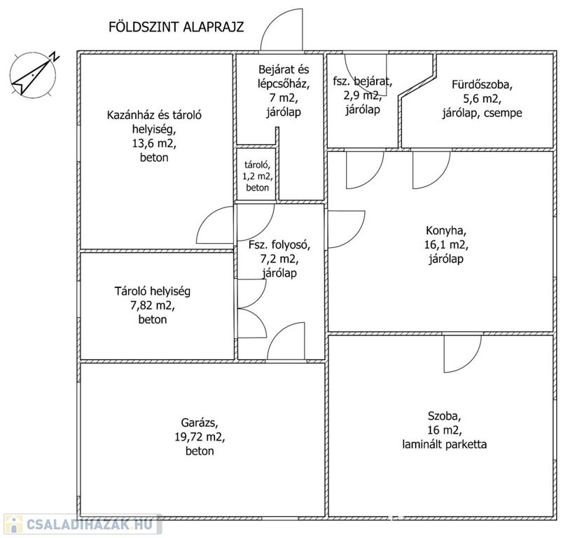 A földszinten 50 m2-es lakás található egy szobával, konyhával, fürdőszobával. Itt még garázs, tárolóhelyiségek, és kazánhelyiség van.
