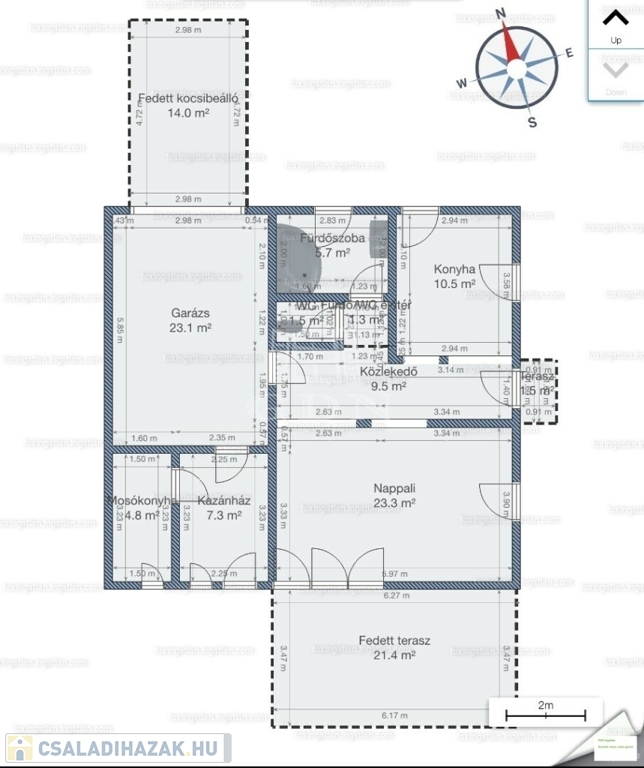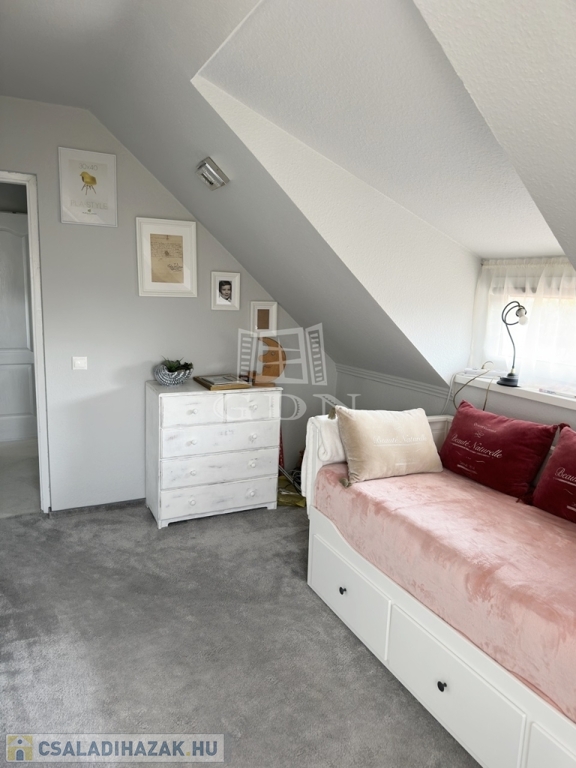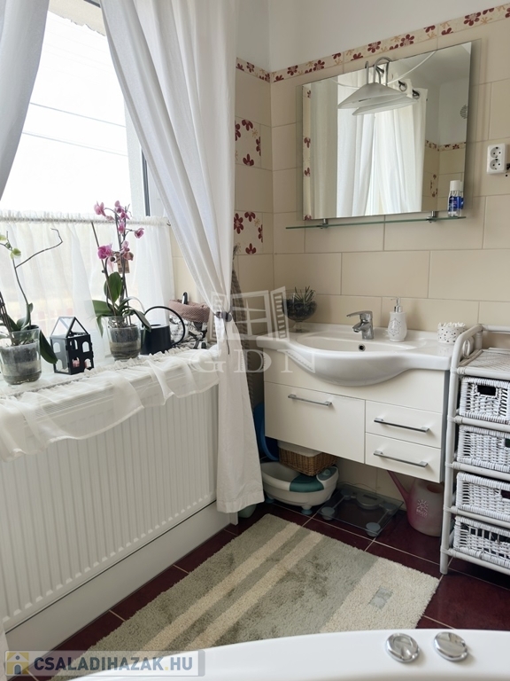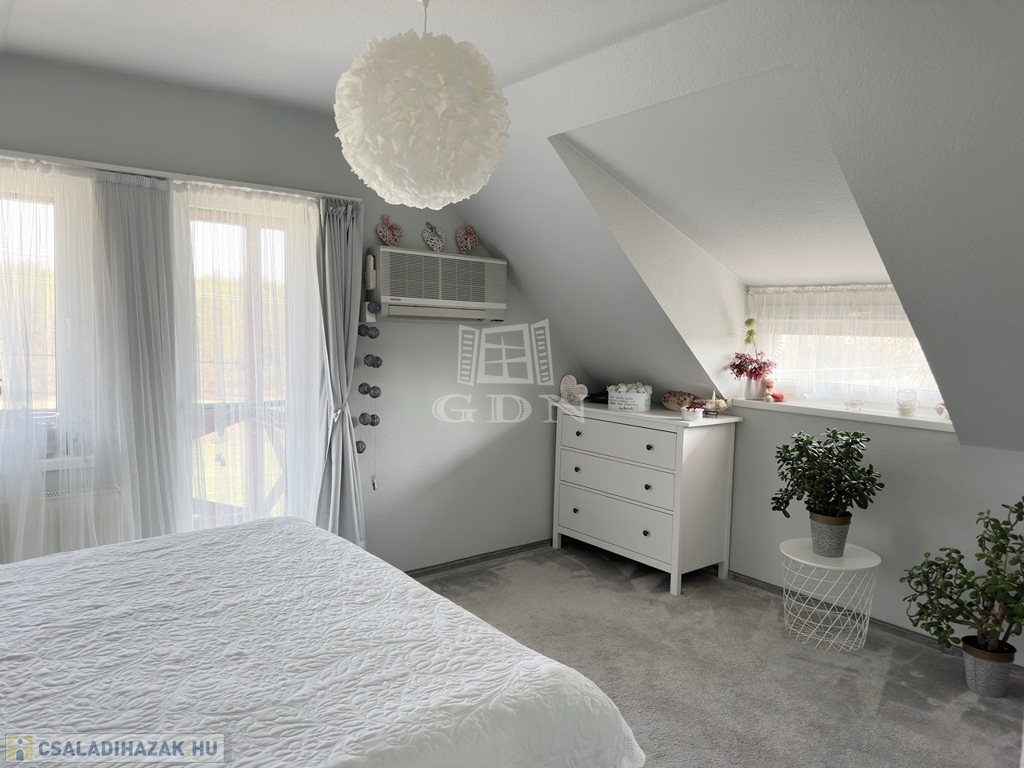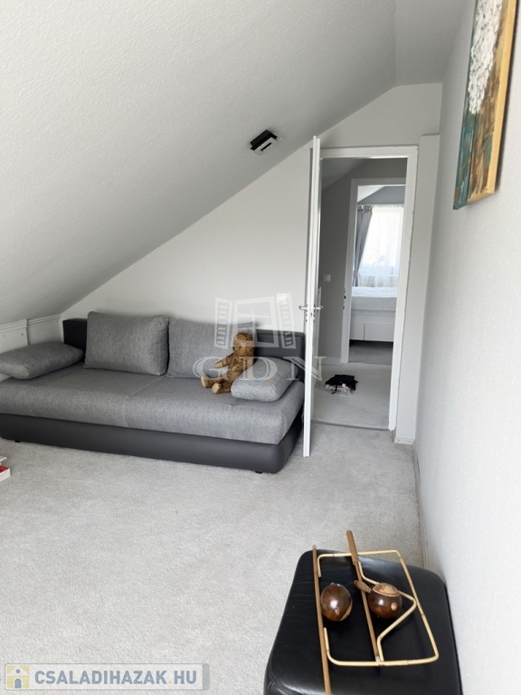 Az ingatlanba lépve az egy légtérben található közlekedő, konyha-étkező, nappali részre érkezünk. Innen nyílik egy sarokkádas fürdőszoba, egy mellékhelyiség, a lépcsőház az emeletre, illetve a házban lévő fűtött garázs felőli bejárat. A nagyméretű műanyag ablakoknak köszönhetően az egész élettér világos és barátságos. A nappaliból egy fedett terasz biztosítja a kertkapcsolatot. Az emeleti szinten két félszoba, egy fürdő w.c.-vel, valamint egy erkélyes hálószoba kapott helyet, kilátással a Gödöllői dombságra. A garázson keresztül érhető el a mosókonyha és kazánház ahonnan szintén kiléphetünk a kertbe, valamint a nagyméretű spájz is.