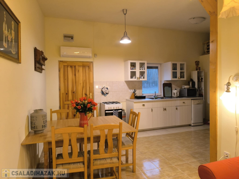 1. épület – 62,9 m²-es, vályogfalazatú, gondosan karbantartott házTágas előtér, nappali, hálószoba, konyha, fürdő + WC, kamra és kertkapcsolatos terasz.Fűtés: vízteres kandalló + inverteres klíma.Meleg víz: villanybojler.Az épület azonnal költözhető, teljes berendezéssel.