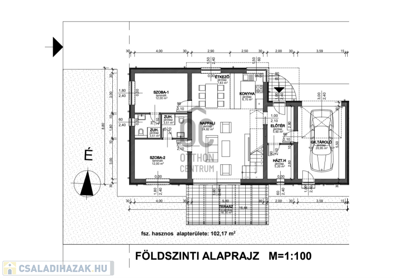 Földszinten található nappali+ étkező egy légtérben, konyha, előtér, háztartási helyiség.