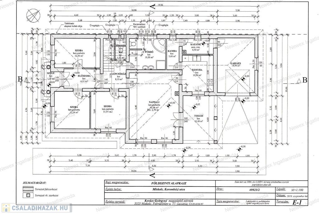 Alsó szint: amerikai konyhás-étkezős-nappali, 3 hálószoba, kádas + zuhanyzós fürdő, külön WC, kamra, kazánház, előszoba, közlekedő, tároló, terasz és garázs.