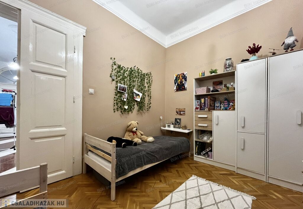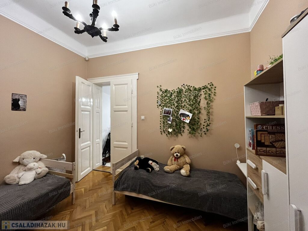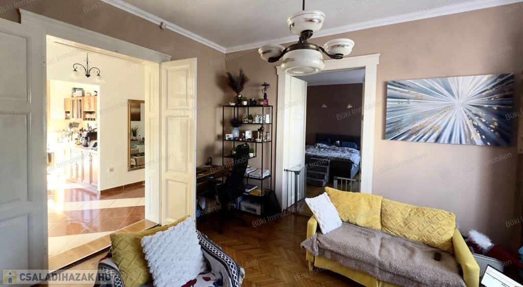 A lakás három külön bejáratú szobát kínál. A szobák nagyméretű ablakaiból bőséges természetes fény árad be, ami egész nap világossá teszi a tereket. A parketta jó állapotú, klasszikus halszálkás mintázata pedig otthonos, időtálló hangulatot biztosít.