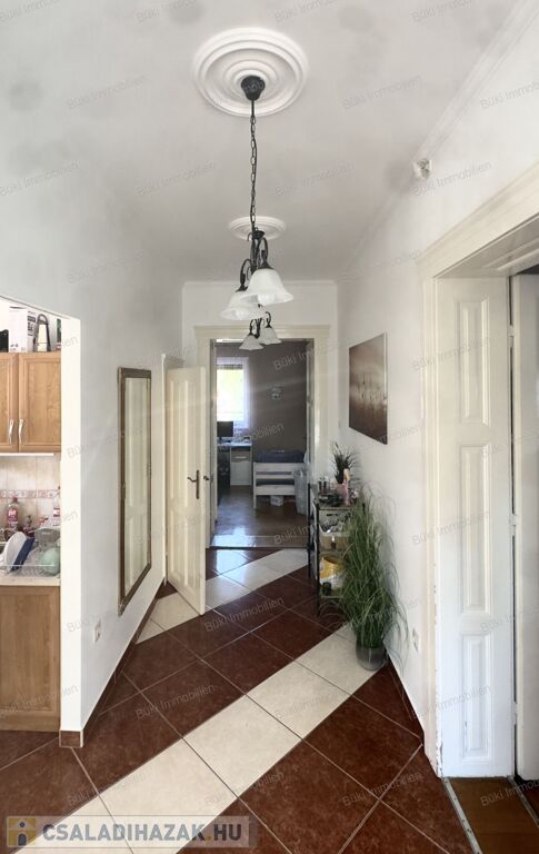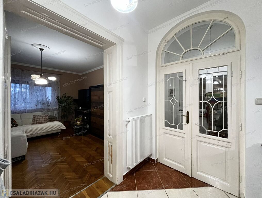 A ház már belépéskor megnyerő: a tágas előtér és az egyedi íves áthidalóval díszített duplaajtó elegáns, karakteres összhatást ad, amit a teljesen felújított belső terek és a világos színvilág tovább erősítenek. A nyílászárók modern, műanyag szerkezetűek, redőnnyel felszerelve, a beltér pedig harmonikus, egységes és rendezett.