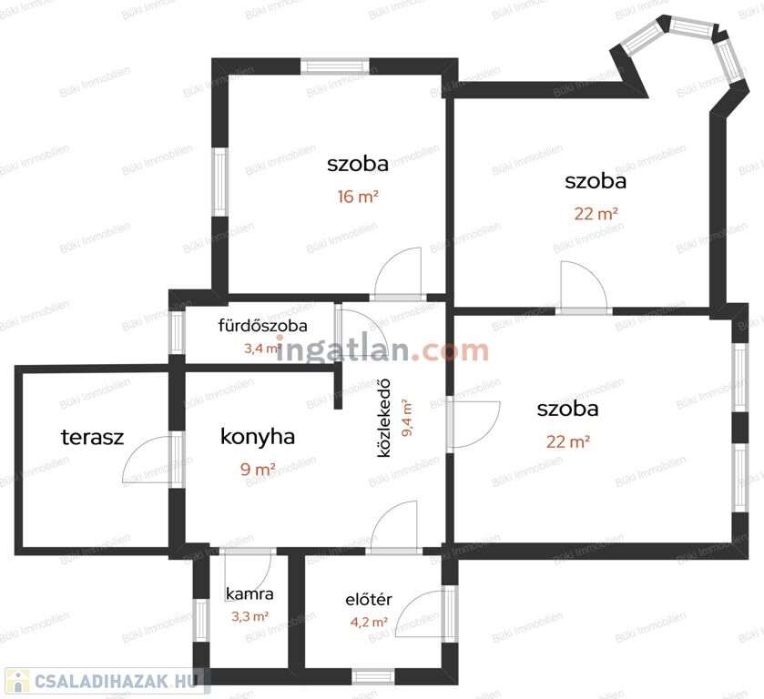 A két 22 m²-es nagyszoba különösen kellemes tér: egyik nappaliként, másik hálóként használva kivételesen világos, és a nagy ablakos öbölrész igazi különlegességgé teszi. Ezen kívül a harmadik szoba tökéletes gyerekszobaként, akár dolgozó szobaként használva.