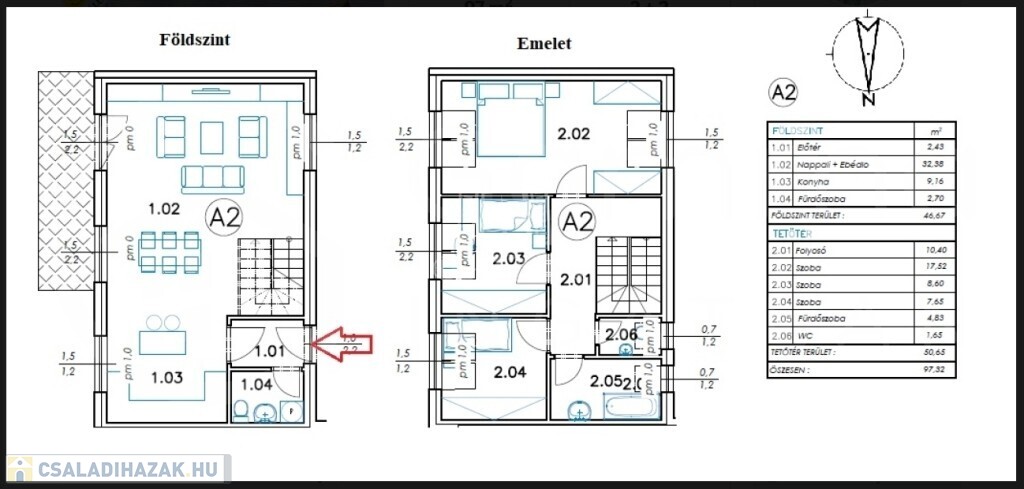 • Földszint: Tágas, napfényes amerikai konyhás nappali étkezővel, valamint egy vendég mosdó-WC.