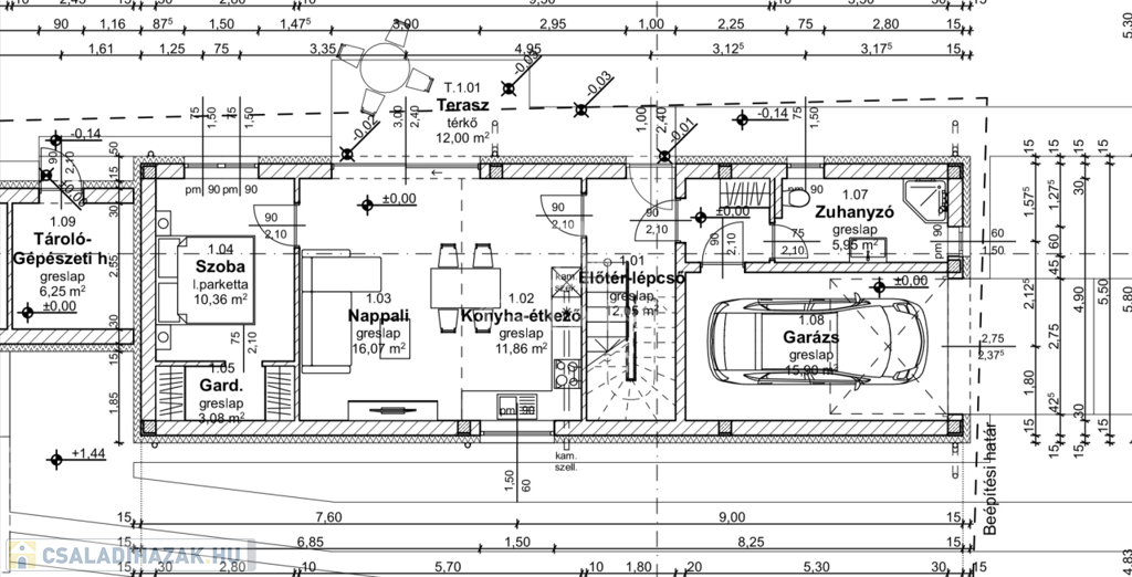 - A homlokzaton 15 cm vastagságú EPS80, a lábazaton 10 cm vastagságú XPS polisztirol alapú homlokzati hőszigetelő rendszer készül 2mm szemcsenagyságú dörzsölt vakolattal törtfehér kivitelben. A lábazat igazodik a cserép színéhez.