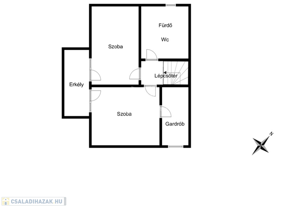 Az emelet két hálószobát, egy gardróbszobát, fürdőszobát és egy erkélyt kínál.