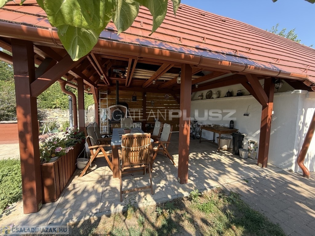 A gyönyörűen parkosított, körbekerített telken nagy fedett terasz, ahol megtalálható egy épített kemence is.