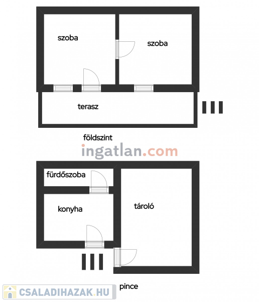 Az alsó részben található konyha, valamint egy helyiség a fürdőnek, mely kialakítása a vevőre vár.
