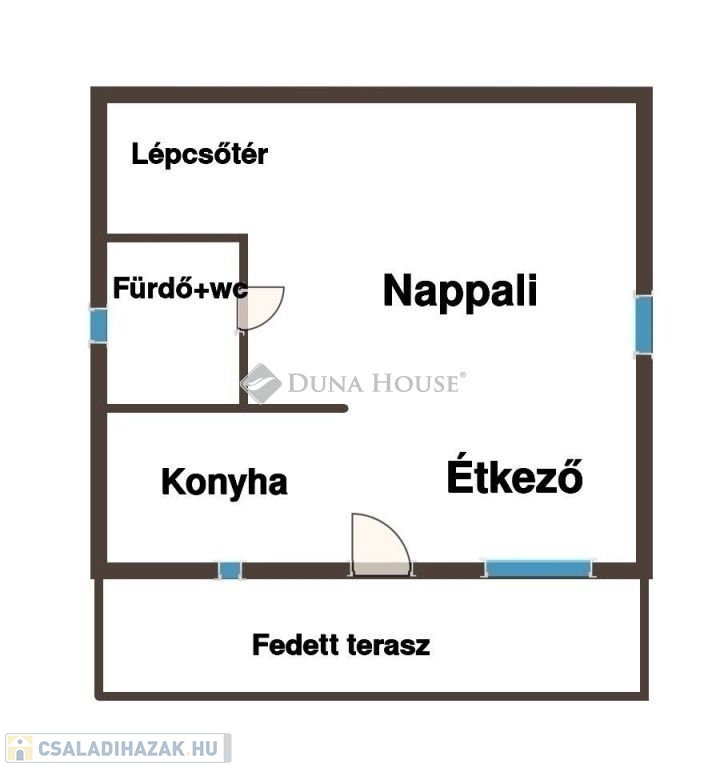 Kialakítása: földszinten: konyha, étkező, zuhanyzó+wc, fedett teraszemeleten: 3 szoba, erkély