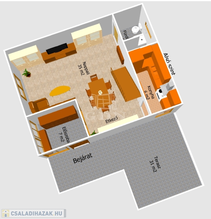 - fürdő-wc (kád+ tusoló - meleg víz ellátás 80L-es bojler)