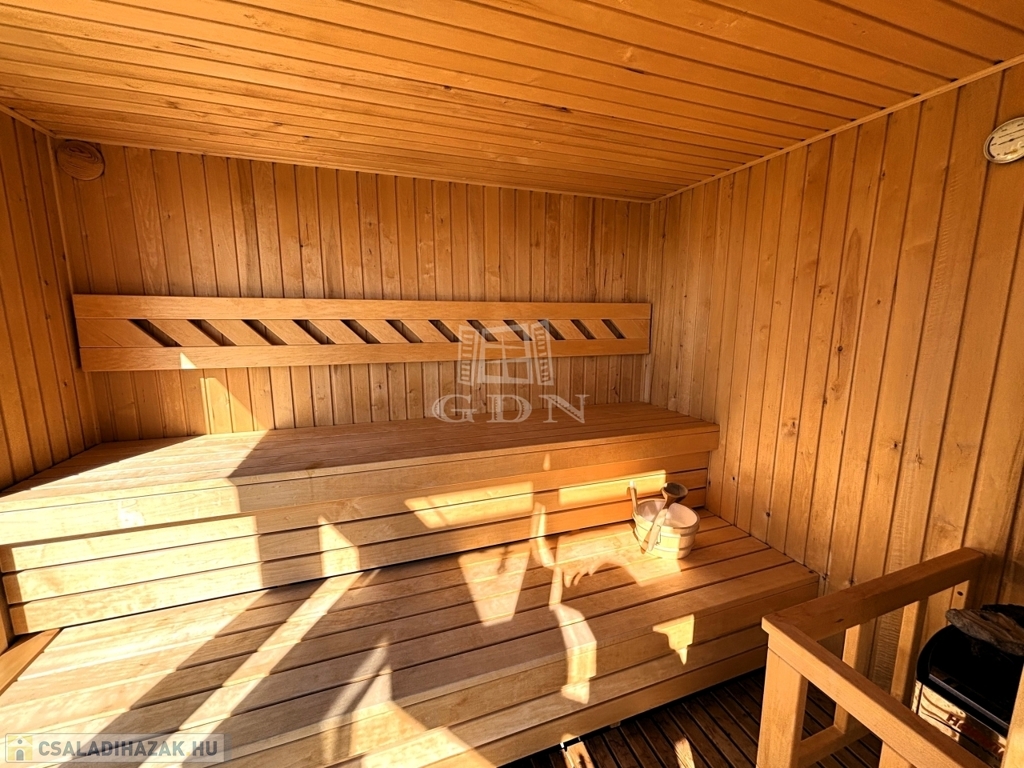 - KÜLÖNÁLLÓ WELLNESS ÉPÜLET szaunával, dézsával, kinti zuhanyzóval, FEDDETT PIHENŐRÉSSZEL és hangulatos esti világítással.