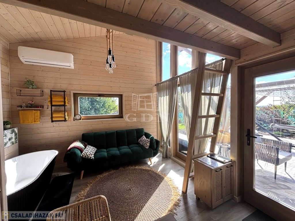 Eladó Monor csendes részén, 2136 m²-es nyugodt, gyönyörűen PARKOSÍTOTT telken ahol a belső béke és a természet harmóniája találkozik, egy 28 m²-es galériás modern faház SZIGETELÉSSEL és thermo üvegezéssel.