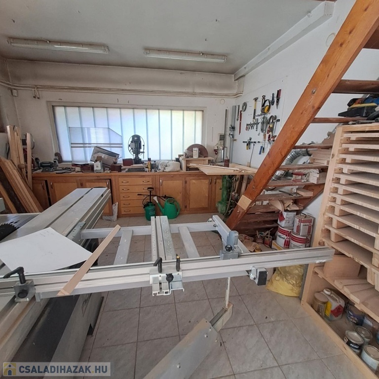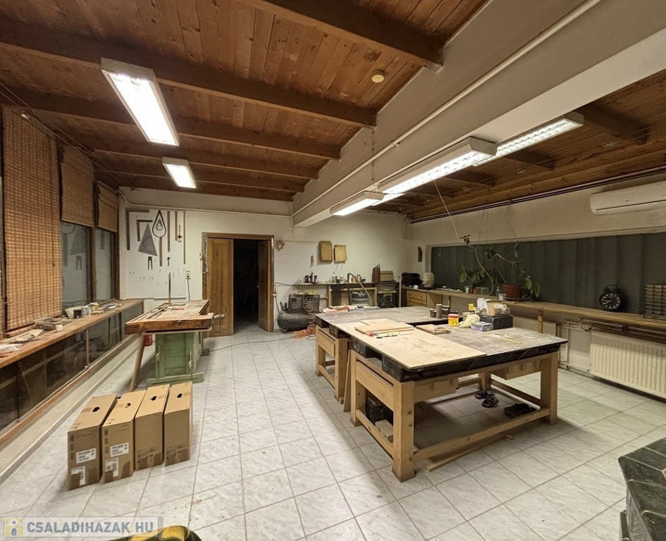 A ház lakóterülete kb. 160 m2, melyben földszinti részen található előszoba, étkező/télikert, konyha, kamra, 40 m2-es nappali, fürdő, WC. A nappali folytatásában ki van alakítva egy 32 m2-es műhelyként funkcionáló helység, melynek tetőterében egy iroda és zuhanyzó lett kialakítva. Igény szerint lakhatásra is át lehet alakítani.