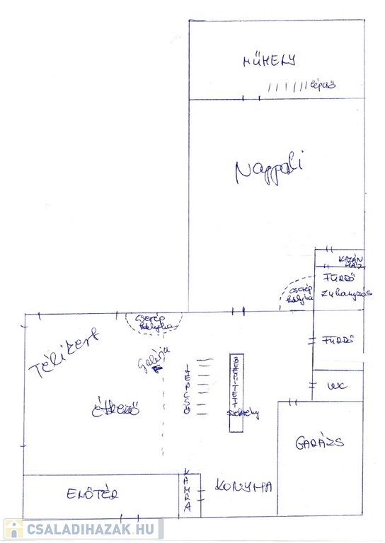 A telek első részén található egy kb. 40 m2-es bontandó vályogház, mögé épült 1984-ben a családi ház.