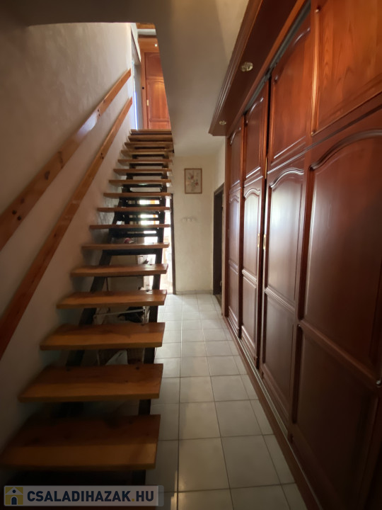 Az alsó szinten található előszoba, nappali, étkező, konyha, kamra, fürdő, külön wc-vel, az emeleten 2 hálószoba van, egy nagyszobával, melyből nyílik a kijárat az erkélyre, beépített szekrények itt is állnak rendelkezésre.