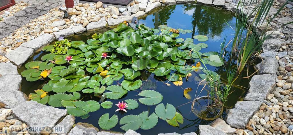 fóliasátor, medencének kialakított terület és kis kerti tó