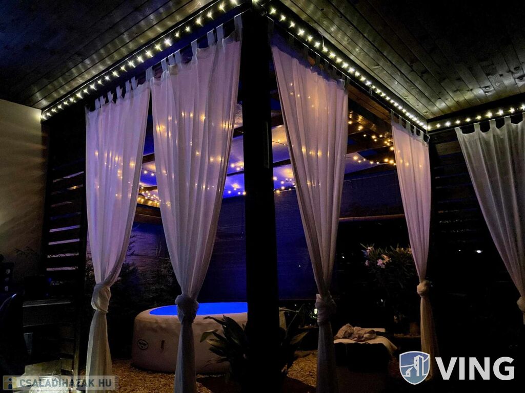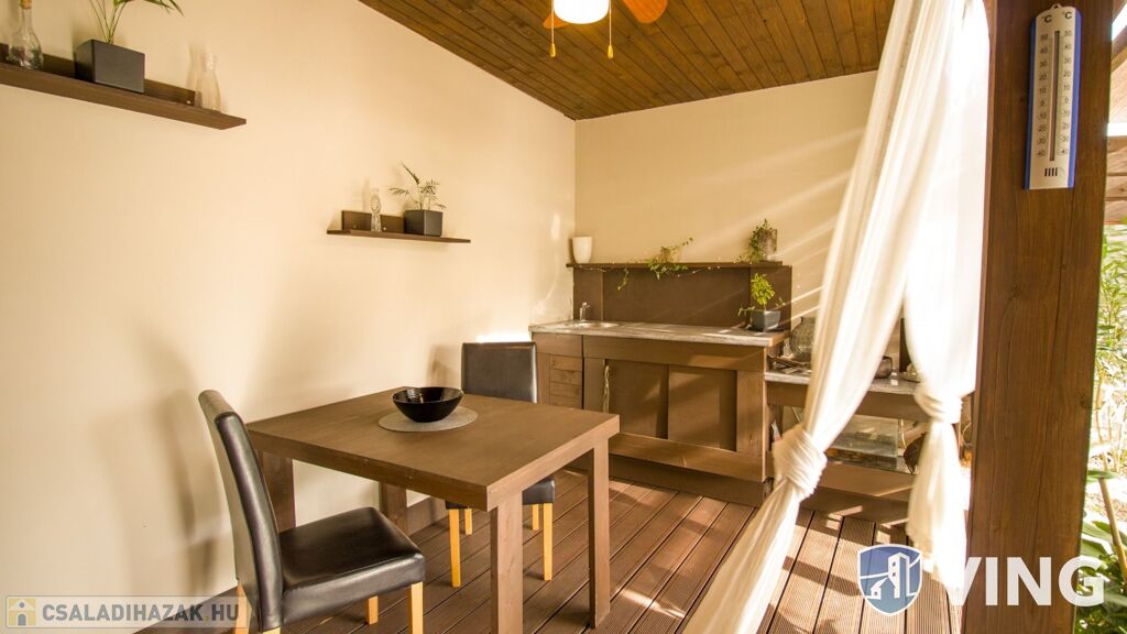 A nappaliból egy nagyméretű teraszajtón keresztül lehet kijutni a fedett teraszra, amely több mint 26 nm alapterületű. Az itt található kültéri konyha hideg - meleg vízzel ellátott. A terasz és az egész udvar a dekorvilágításnak köszönhetően sötétedés után különösen megnyerő látvány.