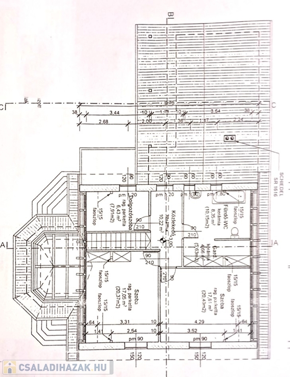-földszint: előszoba (4,91m2), közlekedő, lépcsőfeljáró (9,43m2), szoba (14,96m2),
