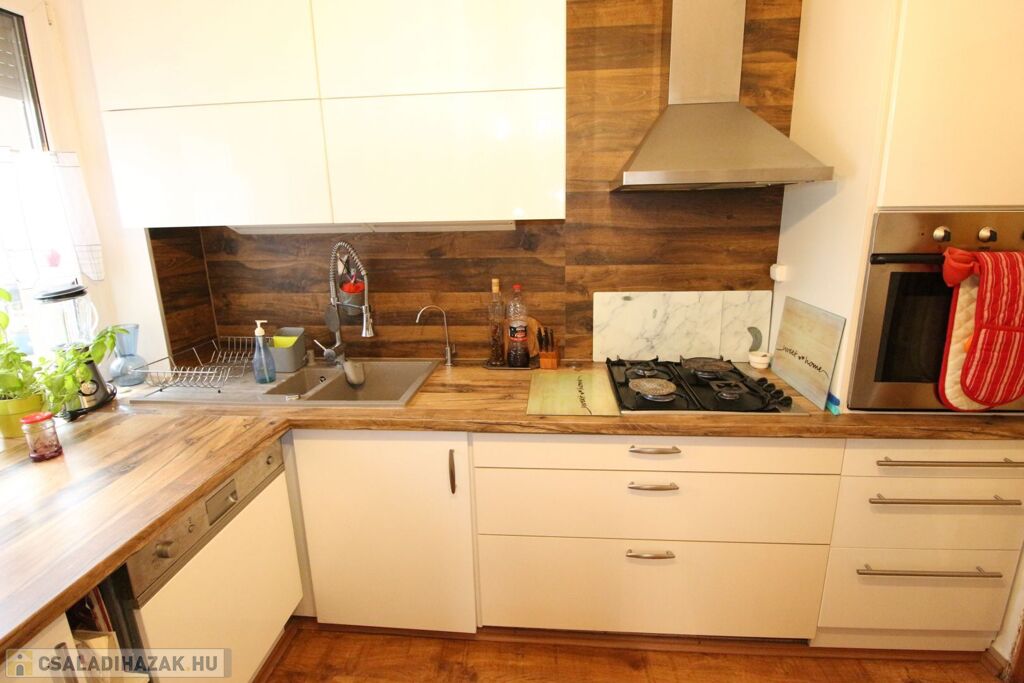 A konyhában egyedi gyártású konyhabútor, beépített háztartási gépekkel felszerelve, elektromos sütő, tűzhely, páraelszívó és mosogatógép.