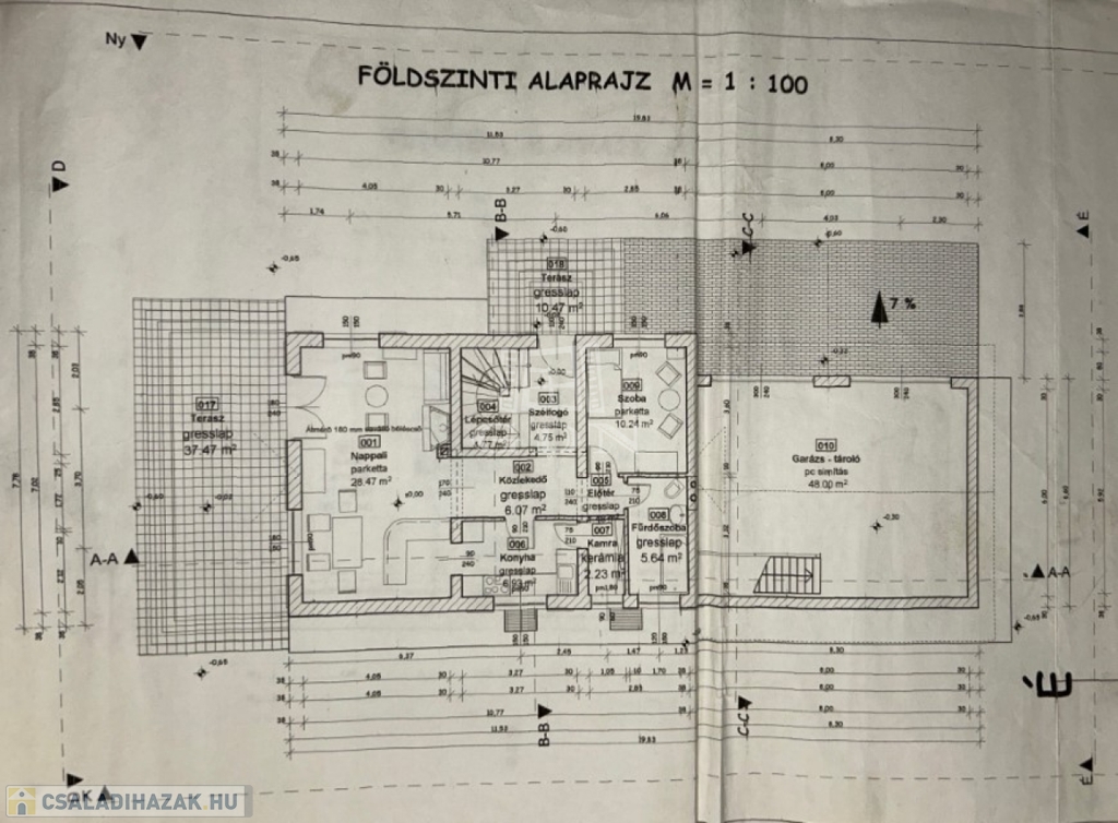 A földszinten nappali-étkező, közlekedő, szélfogó, lépcsőtér, előtér, konyha, kamra, fürdőszoba, szoba lett kialakítva.