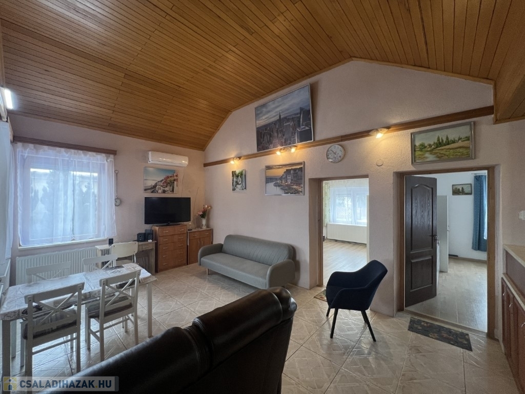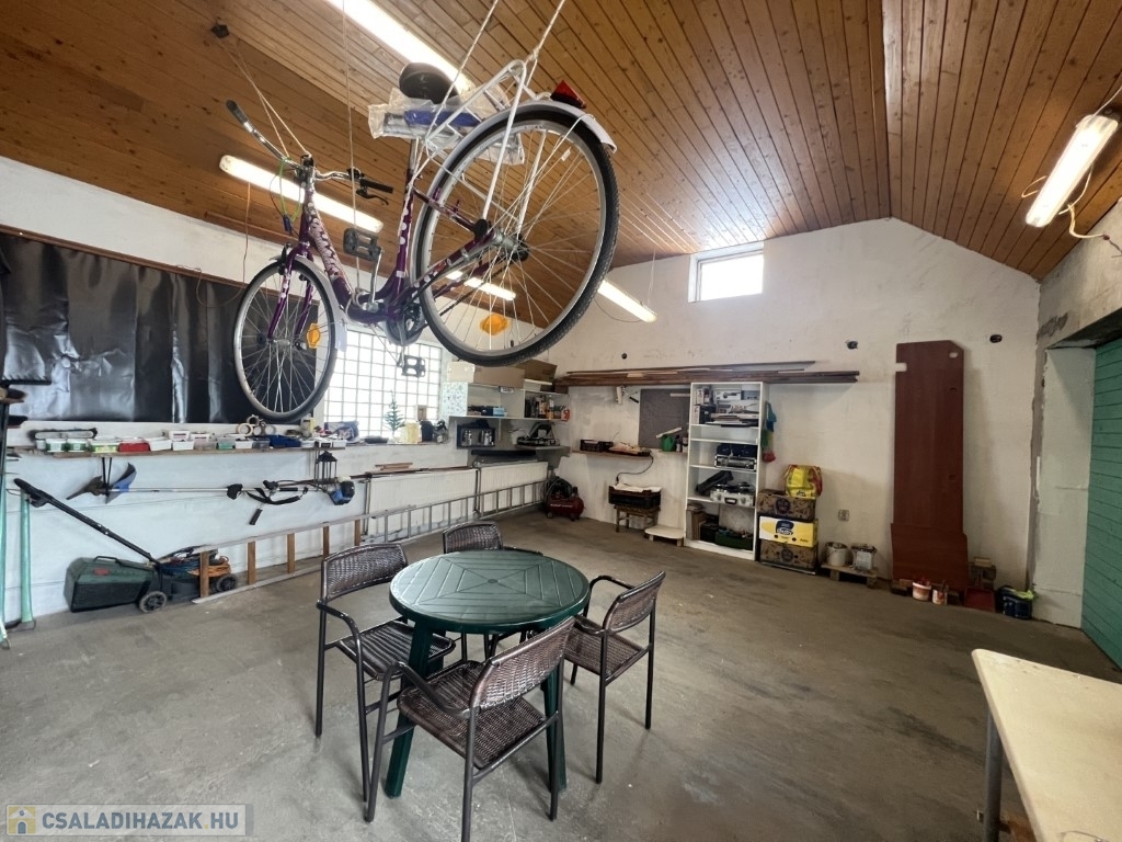 Nagyatádon csendes utcában található hangulatos kialakítású, korszerű energetikájú, felújított 96 m2-es családi ház - akár műhelynek is alkalmas - garázzsal együtt eladó. A lakóházban beépített világos előtér, magas belmagasságú nappali-konyha-étkező, 2 szoba, fürdőszoba, wc, kamra helyiségek kerültek kialakításra. A lakóház fűtése Ariston típusú gázkazánnal, továbbá vegyestüzelésű kazánnal megoldott, valamint légkondicionáló is felszerelésre került. Az épület a 2000-es évek elején teljes felújításon esett át, továbbá a tulajdonos új műanyag nyílászárókat építtetett be, 15 cm-es hőszigetelést rakatott fel, illetve 5 KW-s napelemeket telepített. Az udvaron 36 m2-es fűtött garázs-wc-kézmosó helyiség, és 2db szerszámok-fa tárolására alkalmas tároló-kazánház, továbbá az udvaron kemence van. Telek: 548 m2