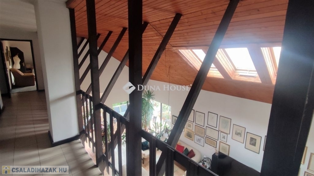 -Galéria, ahonnan rálátás nyílik az alsó szint nappalijára, különleges térélményt adva a háznak