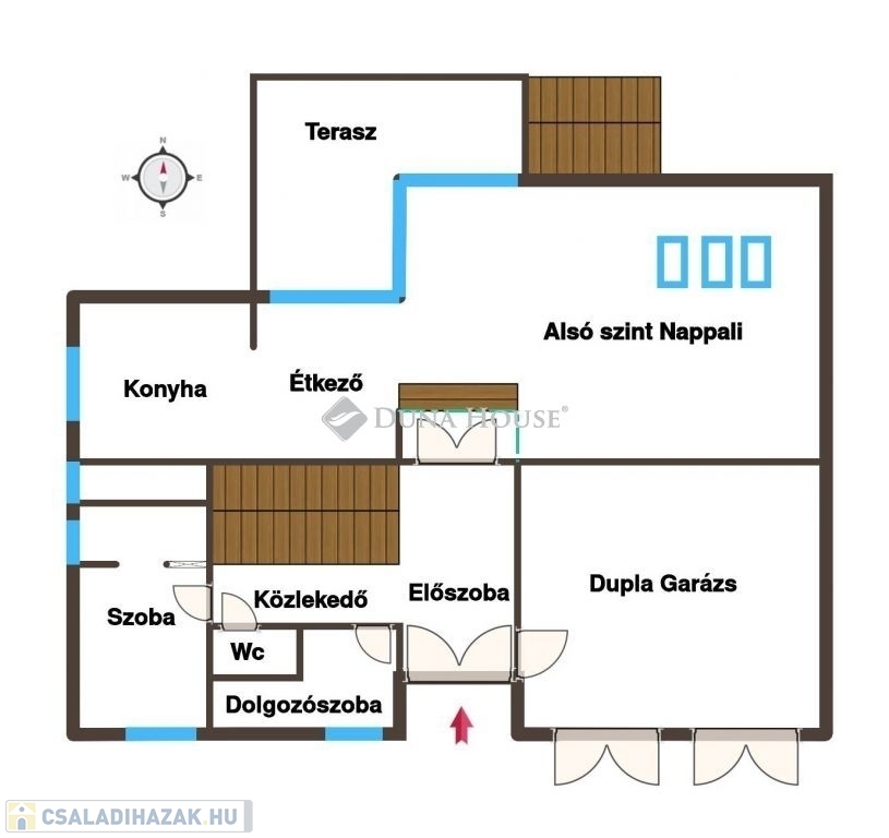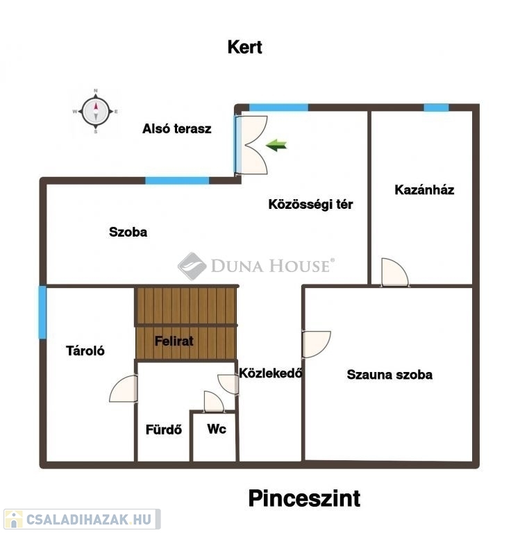 - Csak utcai oldalról pince, a telek lejtéséből adódóan az udvar felől közvetlen kertkapcsolatos ez a szint