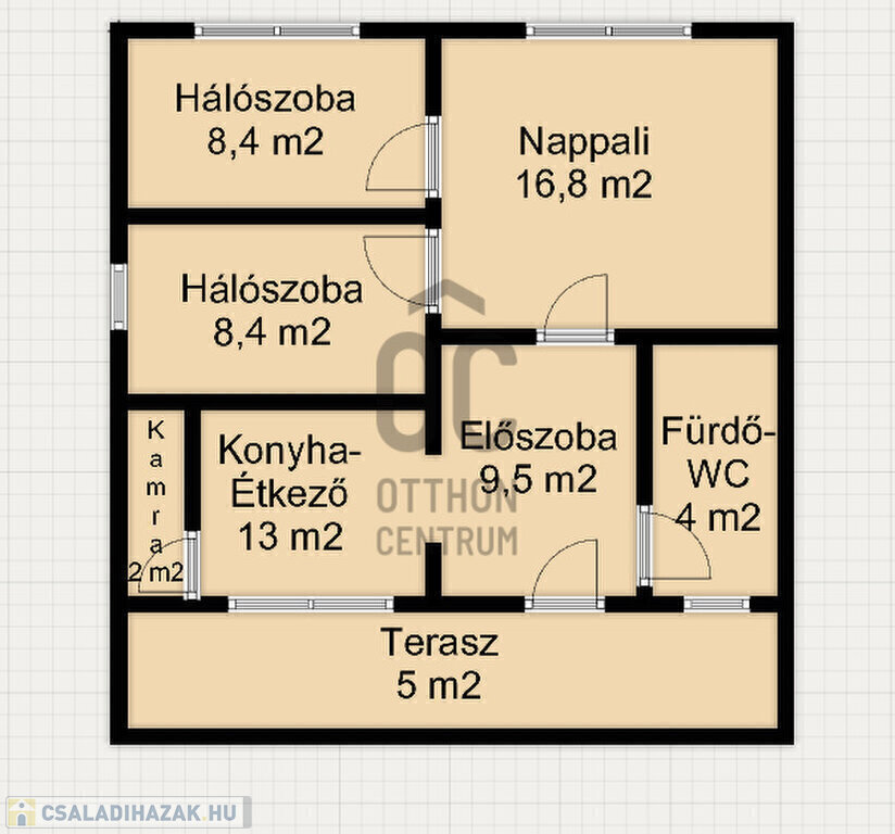 - nagyon jó elosztású, melynek helyiségei: konyha-étkező, 2 hálószoba+nappali, kamra, fürdő-WC, terasz