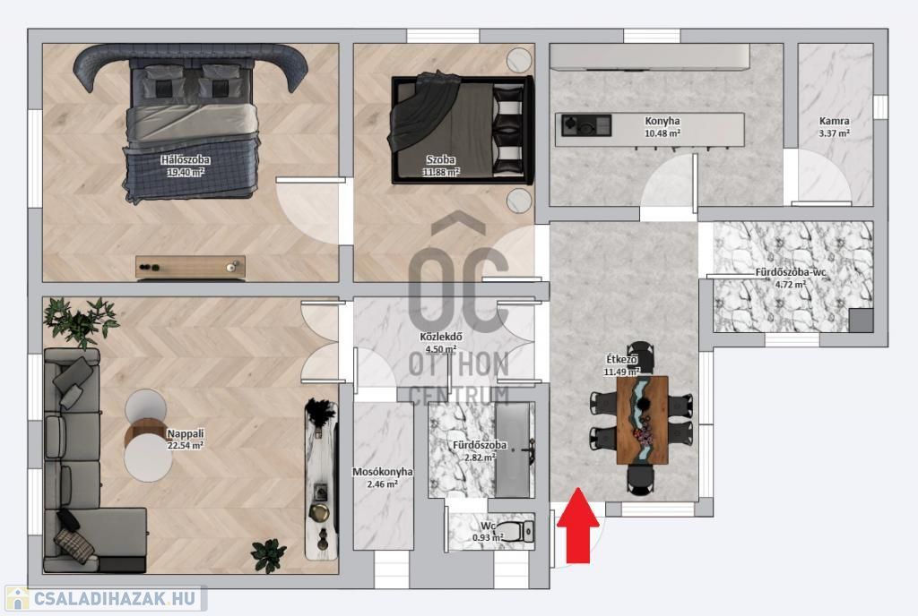 - 3 szobás, 2 fürdőszobával rendelkező.