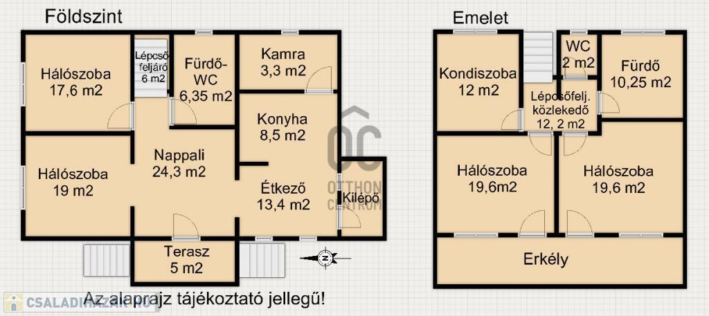 Emelet helyiségei: 3 hálószoba, amelyből az egyik erkély kapcsolatos, fürdő-WC, közlekedő