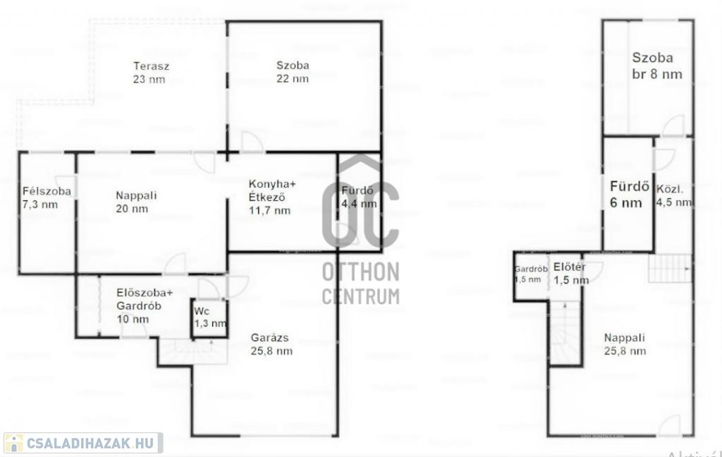 - helyiségek a földszinten: 2 hálószoba, nappali, amely terasz /23 m2/ kapcsolattal rendelkezik, közlekedő, konyha-étkező, fürdő-WC, külön WC, garázs-103 m2