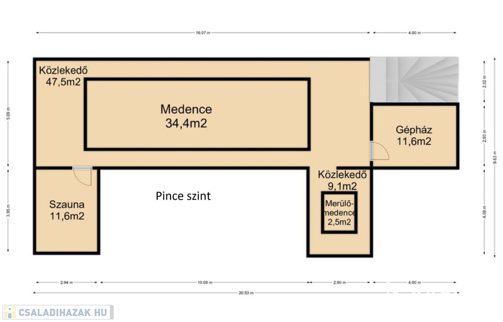 Pinceszint: (megközelítőleg 8m-re a föld alatt) 154m2 - Wellness részleg, nagy méretű medencével, szaunával, merülő medencével, gépészeti helységgel.