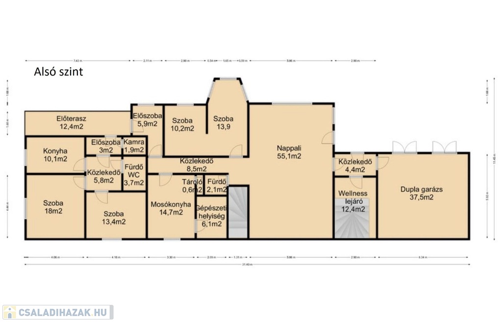 Felső szint: 5 külön bejáratú szoba, közlekedő, 2 fürdő, nagy méretű nappali közvetlen teraszkapcsolattal.