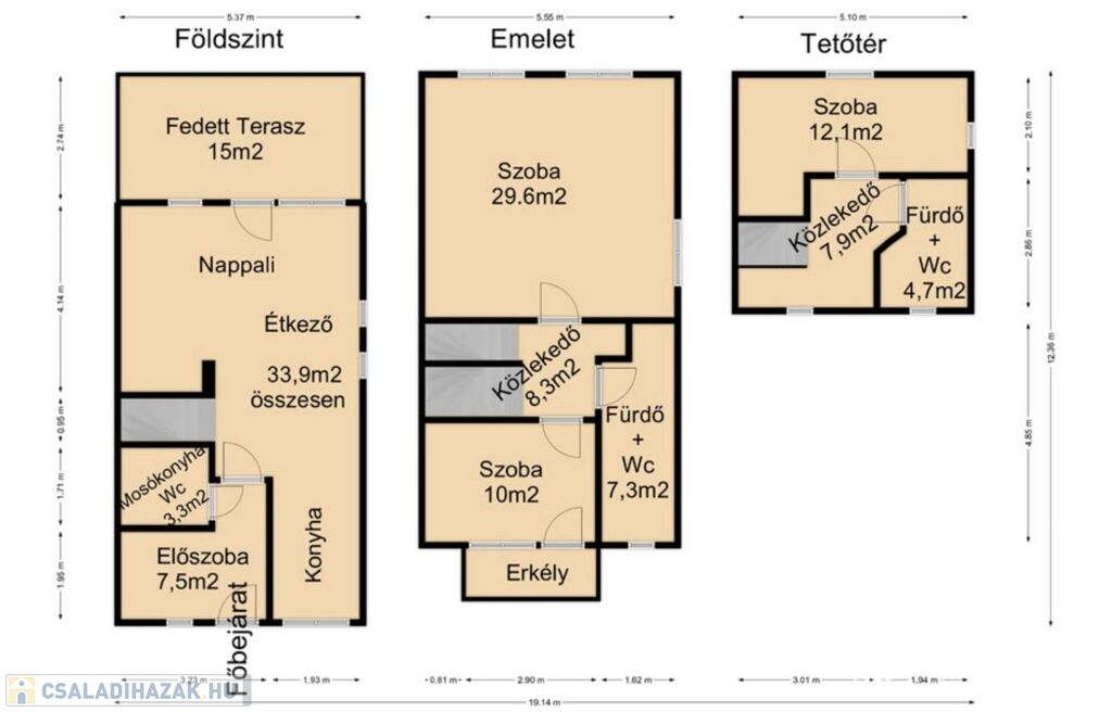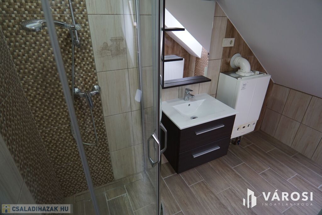 Tetőér: közlekedő, szoba, zuhanyzós fürdő mellékhelységgel együtt.