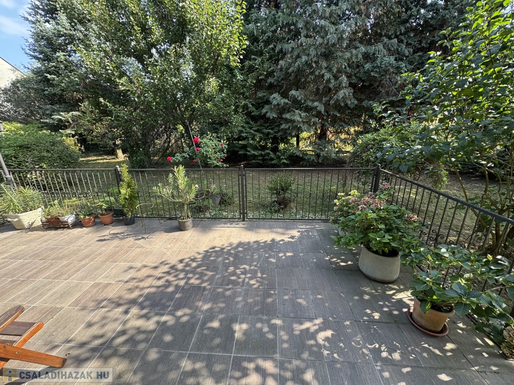 A nagyobb nappalihoz tartozó teraszról gyönyörű kilátás nyílik a kertre, a lombos fák árnyékában igazán mediterrán hangulat uralkodik.