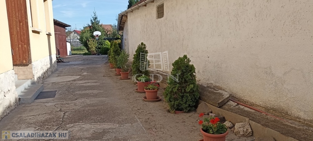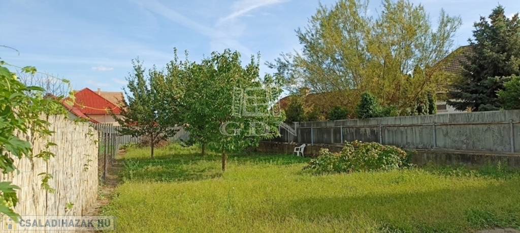 A ház első részén betonozott udvar, a hátsó telek füvesített, fákkal beültetett.