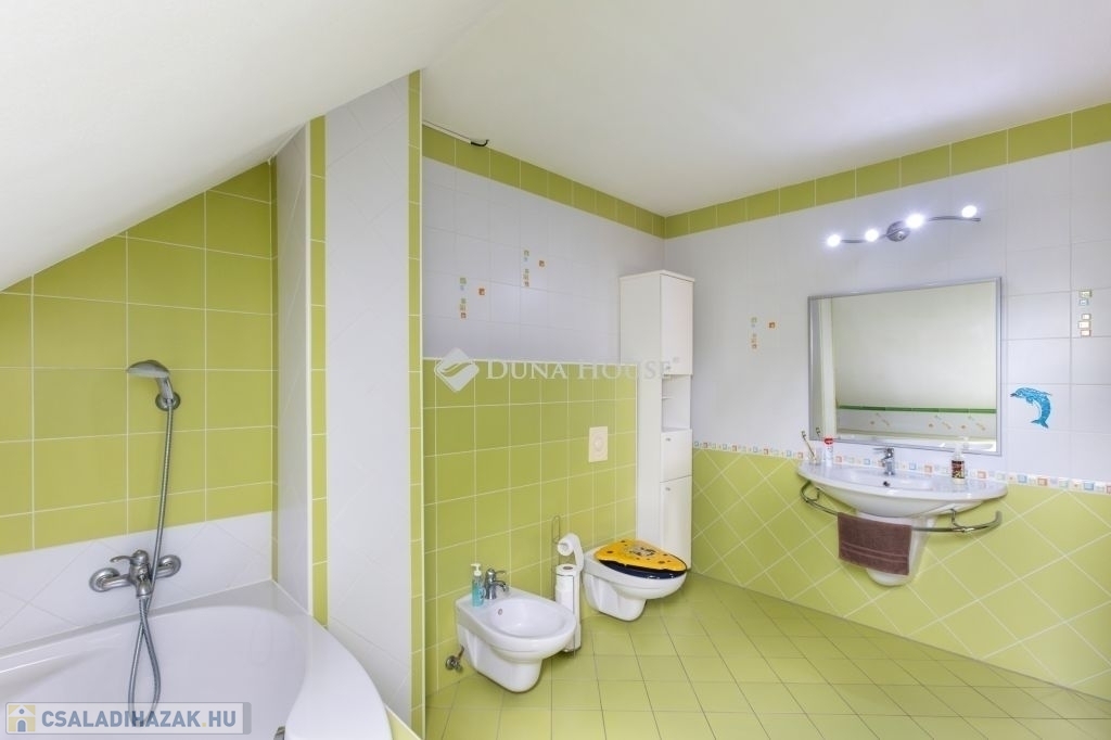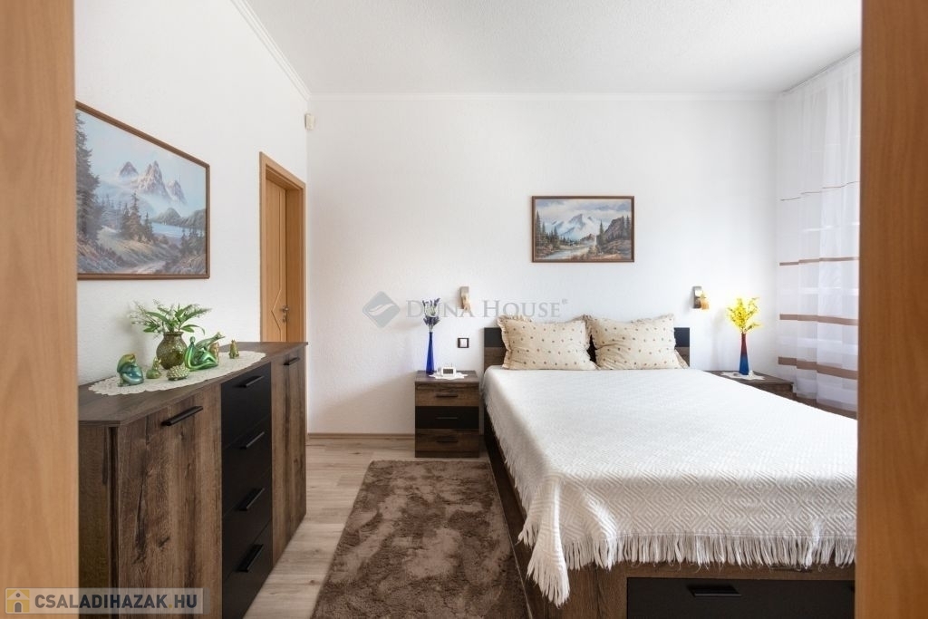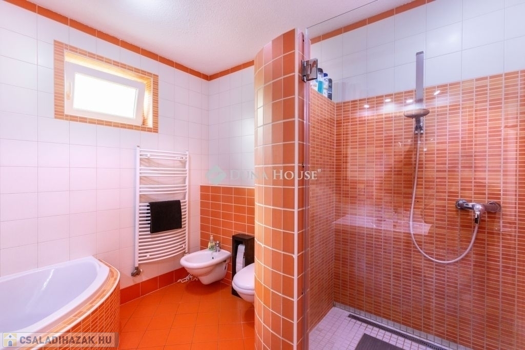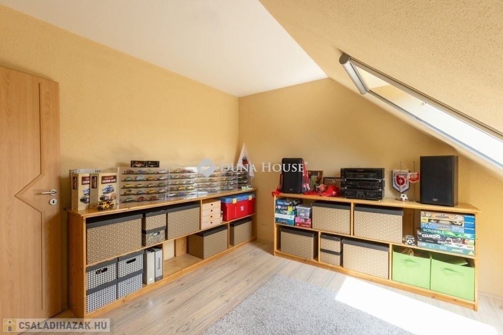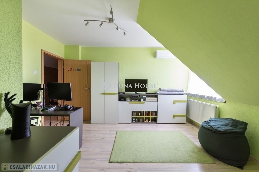 Tetőtér 58m²- 3 hálószoba- 2 gardrób- Nagyméretű fürdőszoba (épített tusoló, kád, wc, bidé)2. LAKÁS 95m²- Nappali- Amerikai konyha, étkezővel, fedett teraszos kiülési lehetőséggel- 2 hálószoba- Nagyméretű fürdőszoba (épített tusoló, kád, wc, bidé)- Nagyméretű háztartartási helység ( kazán, mosógép, tároló)- Tetőtér beépítési lehetőséggelA két lakást egy fűthető 60m²-es dupla garázs köti össze, benne kialakítva:- Külön wc kézmosóval- Nyári konyha (gáztűzhely, mosogató)Az épület főbb jellemzői:-PTH 38-as téglafalazat hőszígetelt vakolattal-BRAMAC antik cserépfedés-Térkövezet, parkosított udvar- Napelem- Klima