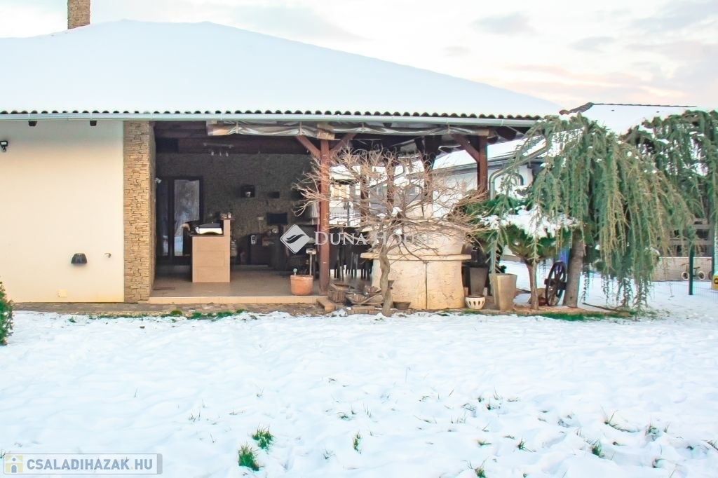 A pakolást egy gardróbhelyiség és a konyhából nyíló kamra segíti.A D-Ny-i tájolású nappaliból jutunk ki a hatalmas fedett teraszra és a kertbe, ahol az öntözőrendszer segítségével könnyedén gondozhatjuk a növényeket.