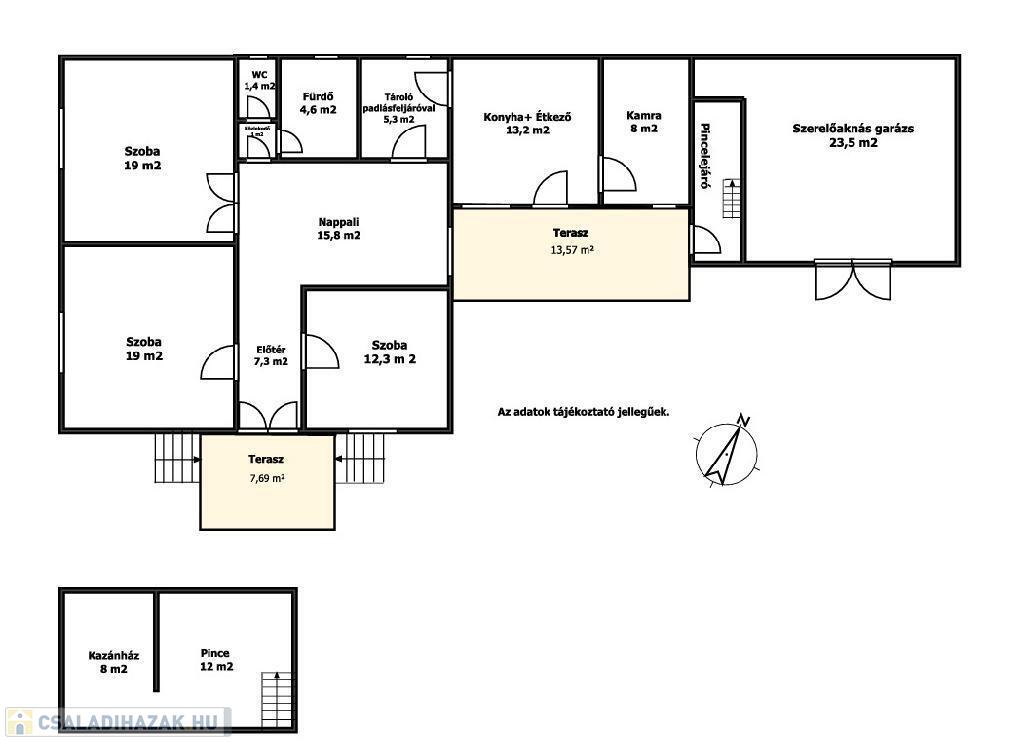 Az ingatlan három szobás, étkezős, külön konyhás, valamint két fedett terasszal és alagsorral rendelkezik, ahol a kazánház és a tüzelőtároló kapott helyet. A tetőtér beépítésére a lehetőség szintén rendelkezésre áll.