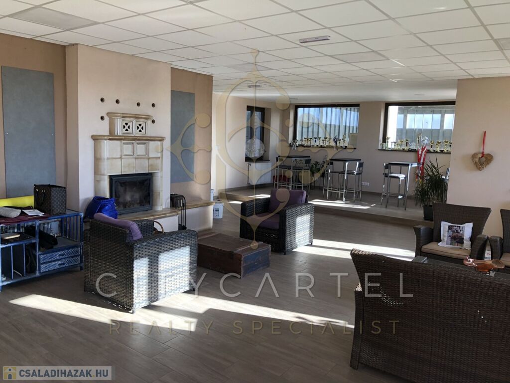 123 négyzetméteres földszint konyhával, lovas tartózkodó térrel, kandallóval, fedelesbe betekintő nyílászárókkal, a lovasok kényelmét szolgáló ülőgarnitúrákkal, 3 WC-vel van ellátva. A pincébe és az emeletre lépcsőház vezet.