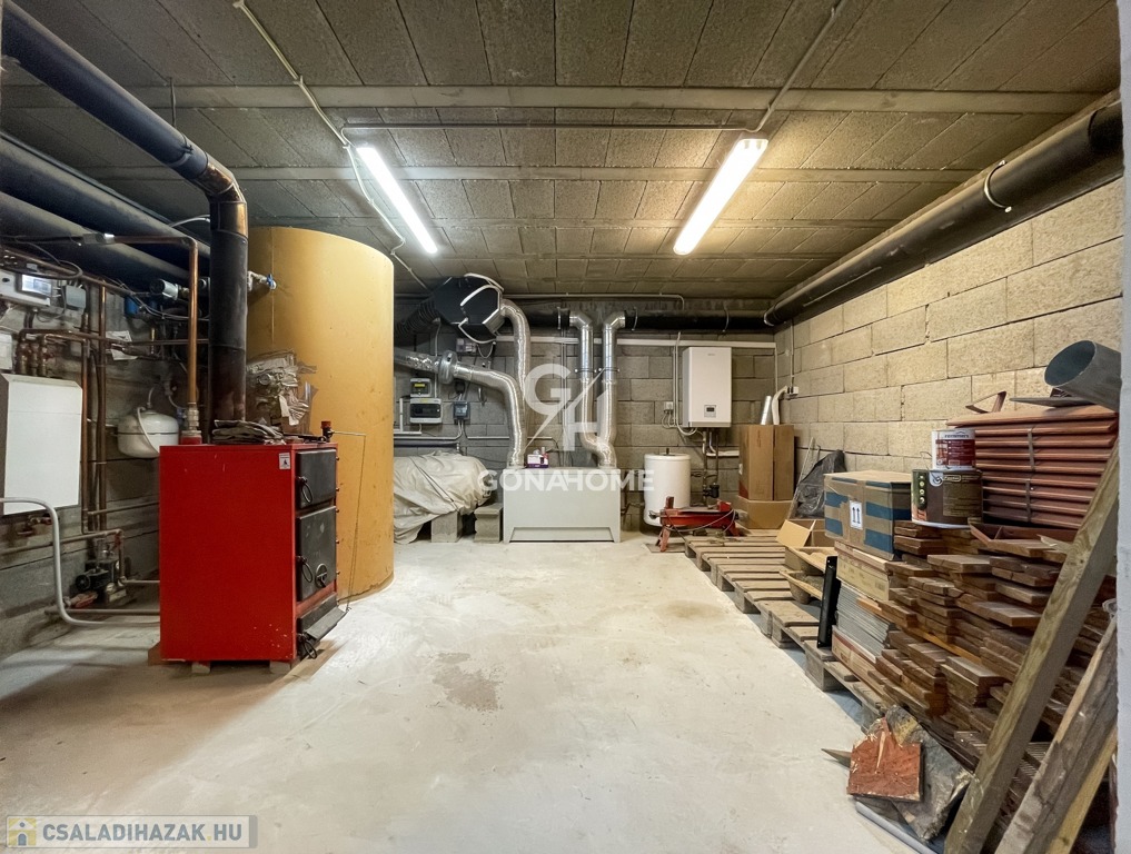 - A pincében található a gépészet (napelem és hőszivattyú beltéri egységei, tartalék vegyes tüzelésű kazán, puffer tartály, használati melegvíz tárolók, valamint a garázs.
