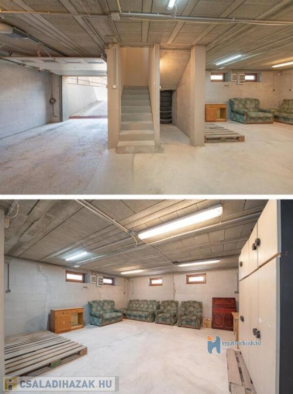 A pincében található minden gépészet (napelem és hőszivattyú beltéri egységei, központi szellőztető rendszer hőcserélője, tartalék vegyes tüzelésű kazán, puffertartály, használati melegvíz tárolók, stb...), garázs és egy nagy egybenyitott tér. A pince nettó alapterülete 86m2, amely 50%-ban számít bele a ház teljes területébe.