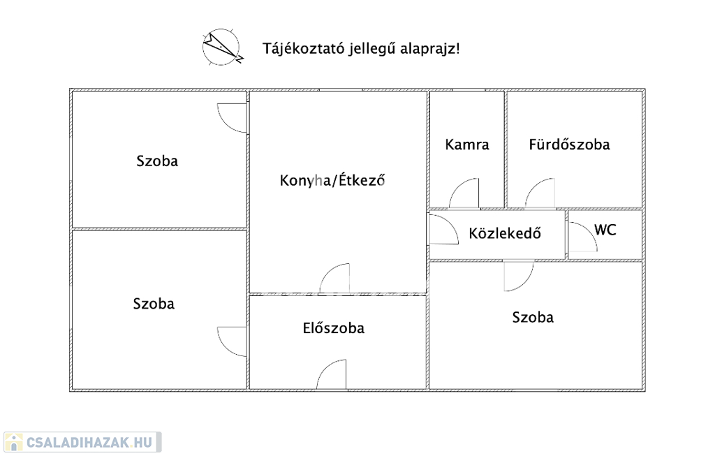 - Az egy szintes ingatlanba található: előszoba, 3 szoba,étkező,/konyha, spájz, fürdőszoba, WC