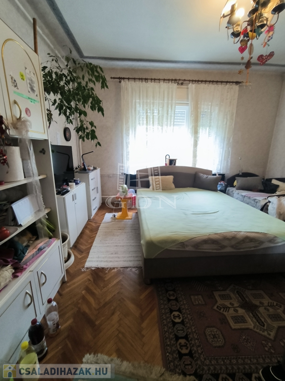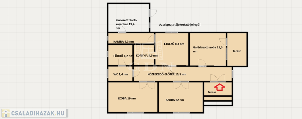 -előtér 15,5 nm, étkező 8,3 nm, konyha, 3,6 nm, kamra 4,3 nm, szoba 22 nm, szoba 11,3 nm, szoba 19 nm, wc 1,4 nm, fürdő 4,2 nm, tároló-pince kazánokkal 19,4 nm.