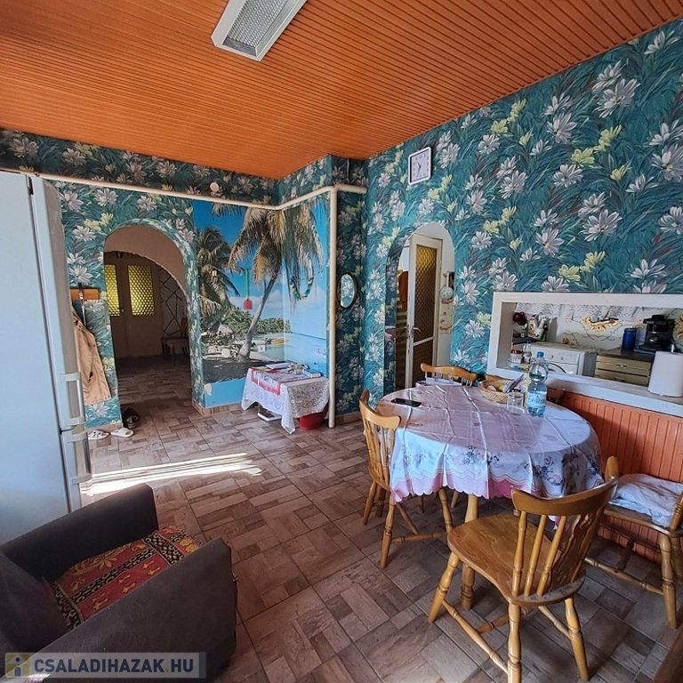 A fő lakóház lakóterülete kb. 60 m2, melyben előtér, 1 szoba, 1 félszoba, konyha, étkező, kamra, fürdőszoba található, valamint 2 fedett terasz tartozik hozzá.