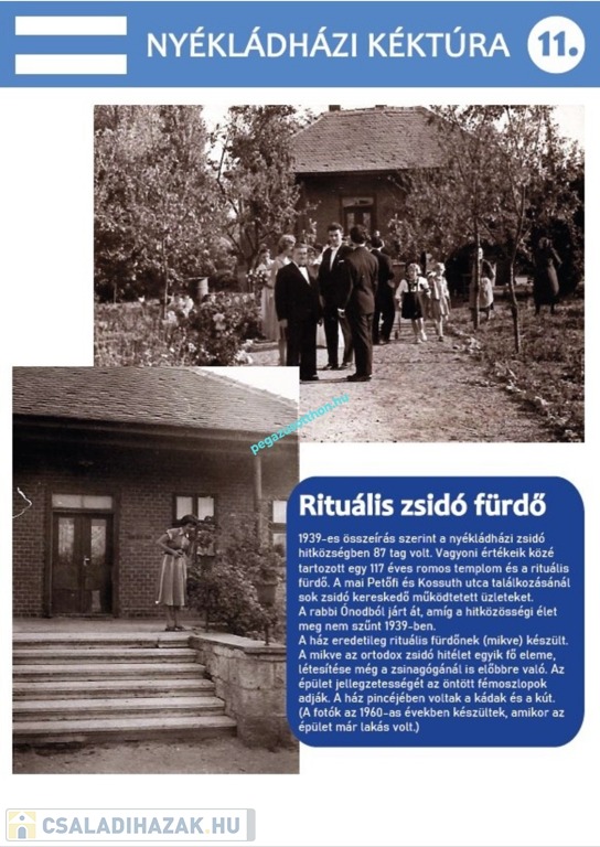 Eladó egyedülálló történelmi épület Nyékládházán – Volt rituális zsidófürdő (Mikve) 1843-ból! Ne hagyja ki a lehetőséget, hogy egy darab történelmet birtokoljon! Nyékládházán eladó egy lenyűgöző, 1843-ban épült épület, mely eredetileg rituális zsidófürdőként (Mikve) szolgált. Az ingatlan egyedi atmoszférája és történelmi jelentősége garantáltan magával ragadja! Az ingatlan és a telek jellemzői: Építés éve: 1843. Telek mérete: 1147 nm. Környezet: Teljes fronton eredeti, az épülettel egyidőben készült kovácsoltvas kerítéssel védett. Melléképületek: Garázs, melléképület és egy hátsó garzonlakás a telken. Falazat: Rendkívül masszív, fél méteres és méteres vastagságú téglafalak, vasúti sín áthidalókkal megerősítve – valódi erődítmény! Pince: A második világháborúban óvóhelyként szolgált. Itt található egy lenyűgöző, 2,5 méter átmérőjű, terméskővel kirakott kút kristálytiszta vízzel. A pincében helyezkedtek el a fürdőzéshez használt kádak. Történelem: A rabbi Ónodból járt át, hogy fogadja a hitközség tagjait. Egyéb: Kiemelt régészeti lelőhely! Különlegességek: Az épület egyedülálló történelmi múlttal rendelkezik. Masszív szerkezete és vastag falai rendkívüli stabilitást biztosítanak. A pince a háborús időkben is menedéket nyújtott, a kút pedig folyamatos vízellátást biztosított. A kovácsoltvas kerítés és a telek elrendezése különleges hangulatot áraszt. A hátsó garzonlakás további lehetőségeket kínál. További információk: Amennyiben szeretné megismerni ennek a különleges ingatlannak a részleteit és átérezni történelmi légkörét, kérem, hívjon bizalommal Ne hagyja ki ezt a rendkívüli lehetőséget, hogy egyedülálló történelmi érték tulajdonosa legyen Nyékládházán! Nyékládháza város Borsod-Abaúj-Zemplén megyében, a Miskolci kistérségben, Miskolctól 14 kilométerre délre. Közúton elérhető a Budapest vagy Miskolc felől a 3-as főúton, Debrecen felől a 35-ös főúton; vonattal a Budapest–Miskolc–Sátoraljaújhely- és a Tiszapalkonya-Erőmű–Tiszaújváros–Miskolc-