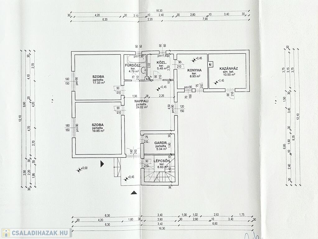 földszint 92 m2: előszoba, nappali, hálószoba, konyha-étkező, fürdőszoba, WC, kazánház, 2 garázs