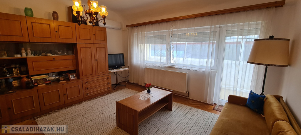 riasztórendszerrel ellátott,redőnnyel és rovarhálóval felszerelt műanyag nyílászárós, járólap és laminált padló burkolatú.
